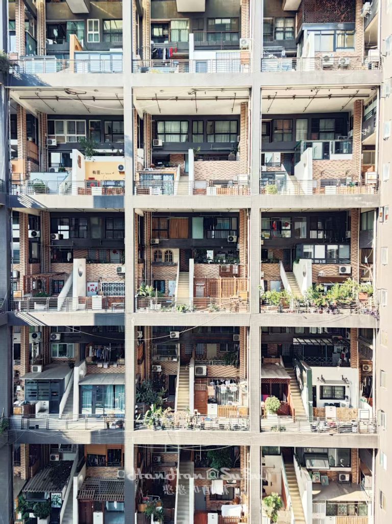 印象扫街:自然派小区(成都自然派小区) / 随记 / 作者: hanhanhesusu 曼哈顿自然派是位于成都市武侯区新希望路4号的独特住宅小区,由成都鑫达房地产开发有限公司于2000年建成,2005年正式开发完成。小区总占地面积25亩,由数栋高层建筑组成,以独特的“空中独院”设计闻名。该项目创新性地在高层电梯公寓中打造了户户带私家独院的居住体验,有点类似现在的“第四代住宅”,采用双面通风采光设计,打破了传统公寓的封闭感。建筑外观色彩鲜明,被网友称为“现实版玩具屋”,成为网红打卡地,里面也有不少空中店铺,类似重庆的红鼎国际。小区毗邻地铁1号线桐梓林站,在桐梓林出站后步行到新希望大厦后面区域就是小区,小区的进口不太显眼,需要仔细寻找,13-14楼的视野比较理想。(适当拍照,不要影响别人隐S)