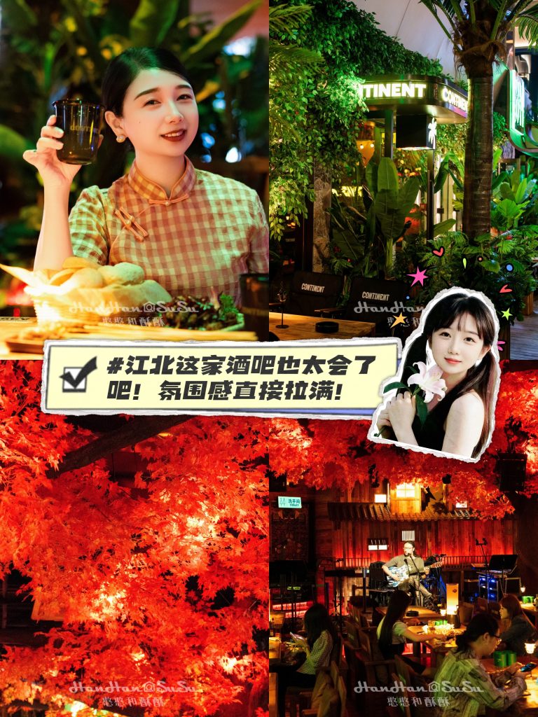 江北这家酒吧也太会了吧!氛围感直接拉满! / 探店 / 作者: hanhanhesusu 姐妹们!挖到宝了!重庆江北这家continent洲酒吧简直是我的快乐老家!🥳🎵【音乐现场堪比演唱会】驻唱实力派~每晚9点半开始,现场直接变成Livehouse!从民谣到摇滚,耳朵真的要怀孕了!🎤🍹【微醺套餐才百元出头】✔️特调酒✔️小吃拼盘✔️果盘喝的百香果白啤和醉月西柚白啤,吃的吊脚牛肉、麻辣牛肉、虾片这些。两个白啤喝上去口感还可以,小吃和串串味道还不错,尤其是麻辣牛肉,外酥内嫩,既有酥脆口感,又有轻微的油脂感,挺不错。姐妹们放心冲!真酒无假,口感醇到上头~🌌【热带雨林风拍照圣地】店铺处处展现热带雨林风!甚至播放的视频都是热带雨林荒野求生!每个角落都能出片📸同时旁边就是北滨路,可以直接观赏渝中半岛夜景哟📍位置:重庆江北北滨路潜能新天地主观总体评价:5⃣分(满分5分)😀优点:1⃣店铺装潢有特色2⃣氛围感总体不错3⃣适合拍照和观景🤔缺点:服务专业性有待提升